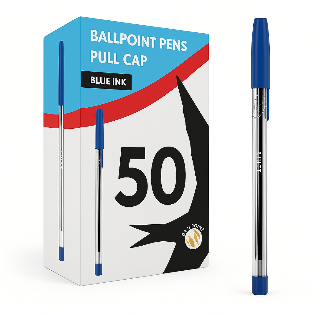 Blue Ballpoint Pens, Medium Tip (1.0mm), Pull Cap - Smooth Writing, Pack of 50